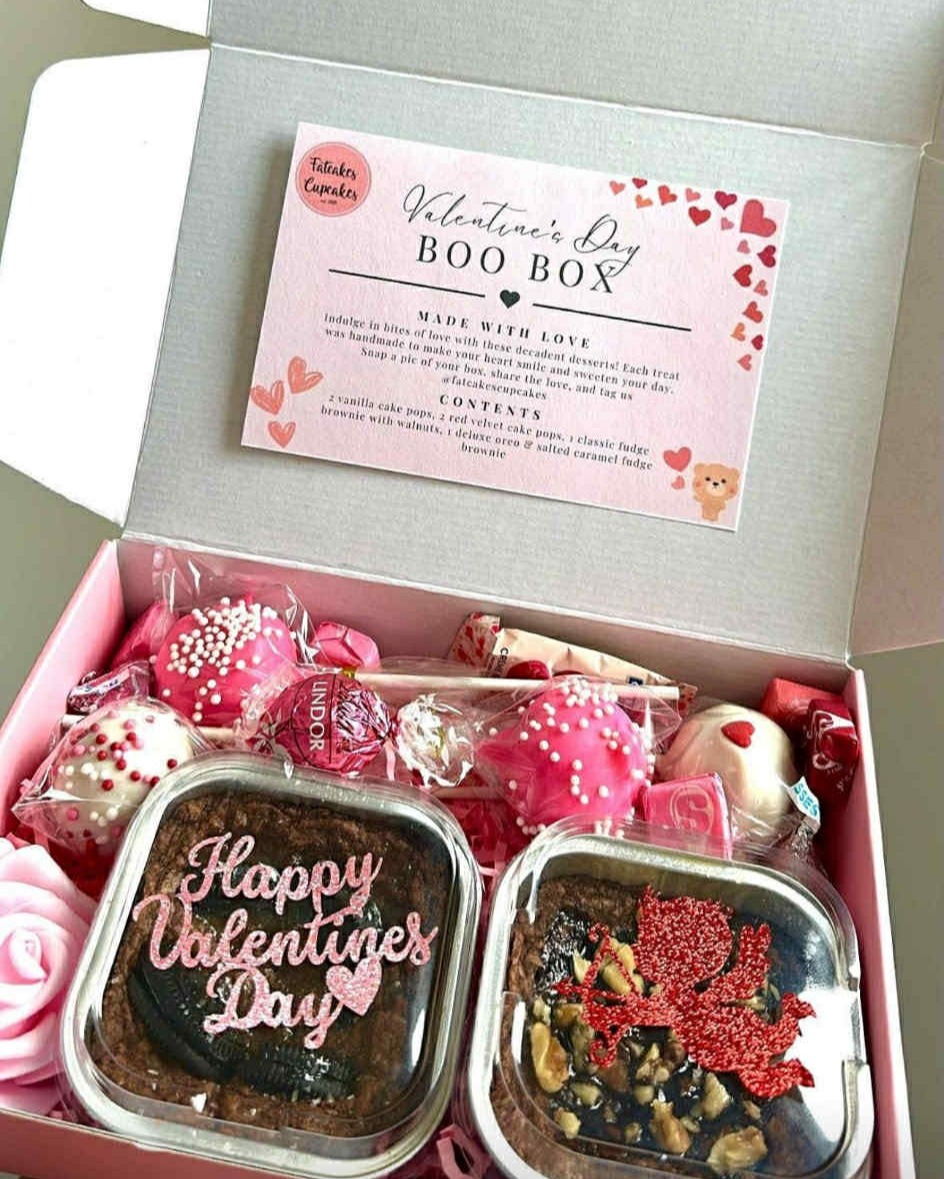 Features two (2) small decorated tin cakes, four (4) chocolate covered strawberries and assorted candies.